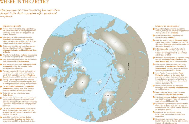 This illustration gives selected examples of how and where changes in the Arctic cryosphere affect people and ecosystems: Impacts on people are presented to the left (1-13) and impacts on ecysostems (14-26) to the right.
